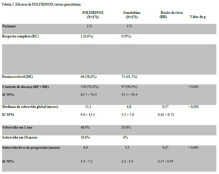 A sobrevida livre de progressão foi superior entre os pacientes recebendo o regime com múltiplas drogas (6,4 meses vs. 3,3 meses, RR = 0,47, IC 95%: 0,37 a 0,59; p < 0,001). A taxa de resposta objetiva foi 31,6% no grupo FOLFIRINOX versus 9,4% no grupo gencitabina (p < 0,001). O efeito benéfico do FOLFIRINOX foi semelhante em todos os subgrupos de pacientes. Estes dados estão resumidos na tabela 2.