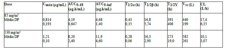 Valores médios de AUC0-48 e Cmax calculados no ciclo 3 (85mg/m2) ou ciclo 5 (130 mg/m2)
