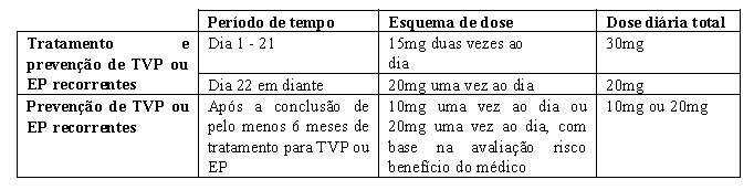 Em ambos os estudos EINSTEIN TVP e EINSTEIN EP, o regime de tratamento comparador consistiu em administrar enoxaparina por pelo menos cinco dias em combinação com antagonista da vitamina K até que o valor de TP/RNI atingisse a faixa terapêutica (≥ 2,0). O tratamento foi continuado com o antagonista da vitamina K com dose ajustada para manter os valores de TP/RNI dentro da faixa terapêutica de 2,0 a 3,0.
