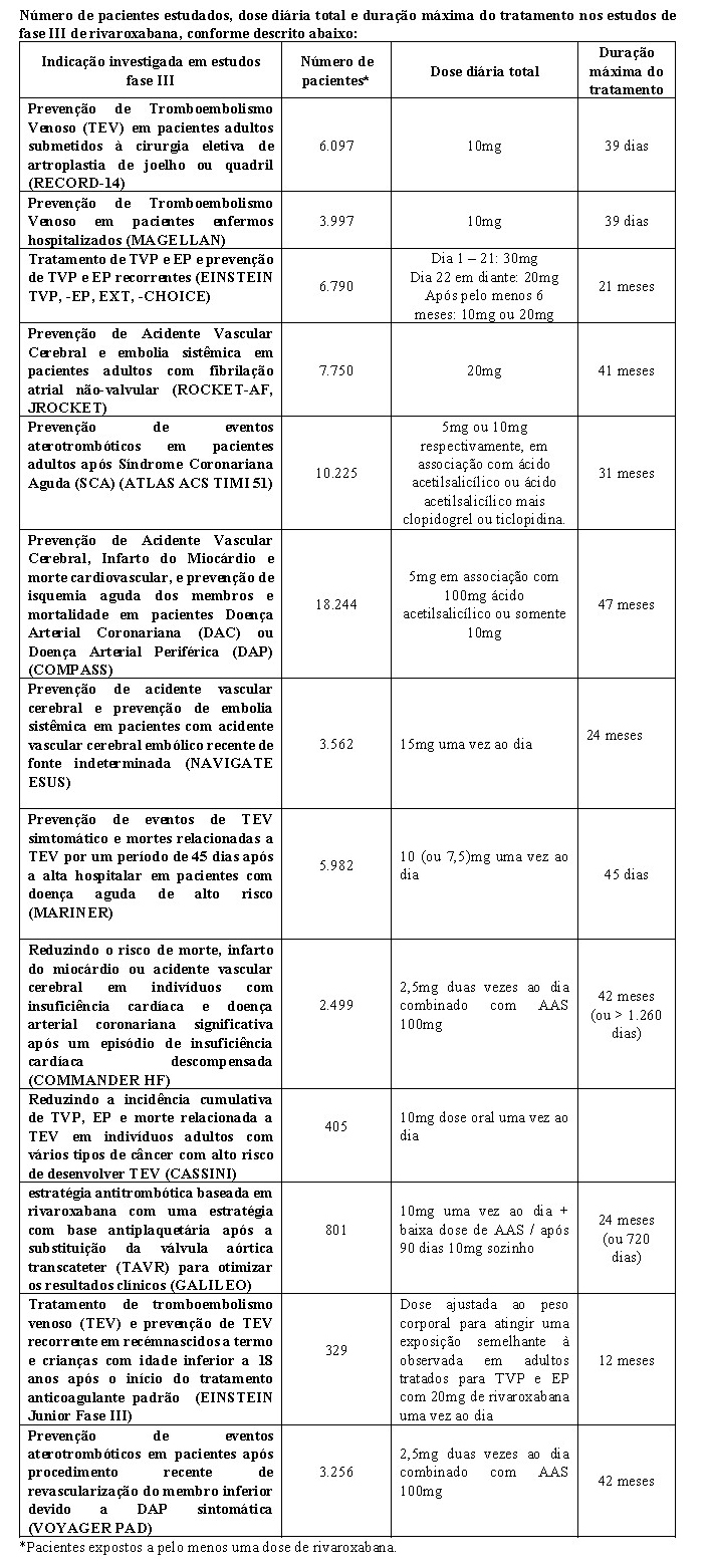 Mais de 12.800 pacientes foram estudados em quatro estudos clínicos de fase III, randomizados, controlados (EINSTEIN TVP, EINSTEIN EP, EINSTEIN Extension e EINSTEIN CHOICE) e adicionalmente foi realizada uma análise combinada predefinida dos estudos EINSTEIN TVP e EINSTEIN EP (veja Tabela 4). A duração total do tratamento combinado em todos os estudos foi de até 21 meses.