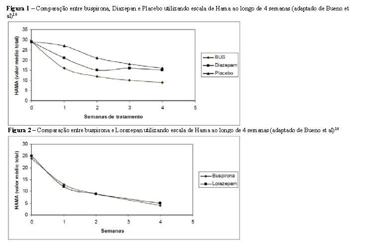 Bueno et al1 realizaram uma compilação dos resultados de 13 ensaios clínicos, envolvendo a população brasileira no período entre 1987 e 1993, para o tratamento de ansiedade não ocasional, incluindo também transtorno de ansiedade generalizada (TAG), com buspirona em comparação a lorazepam, bromazepam, diazepam e placebo. Foram analisados um total de 1904 pacientes, de ambos os sexos (64,88% mulheres), com idade entre 18 e 96 anos (distribuição bimodal: média de 34 anos para estudos duplo cegos e 50 anos nos abertos), todos com HAMA inicial maior que 18, submetidos ao tratamento com buspirona por 4 semanas (dose inicial de 15mg/d). Quanto à eficácia, a buspirona se mostrou semelhante ao lorazepam, bromazepam e diazepam, bem como superior ao placebo (Figura 2 e 3). 80,3% dos pacientes apresentaram boa resposta no tratamento da ansiedade com buspirona. Tal estudo conclui que a buspirona é uma droga tão efetiva no tratamento da ansiedade quanto os benzodiazepínicos testados, e superior ao placebo.