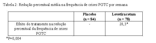 O desfecho primário de eficácia foi a redução percentual a partir do basal na frequência das crises PGTC semanais para os grupos de tratamento com levetiracetam e placebo durante o período de tratamento (titulação + período de avaliação). Houve uma diminuição estatisticamente significativa a partir do basal da frequência de PGTC nos pacientes tratados com levetiracetam em comparação aos pacientes tratados com placebo. A significância estatística versus placebo indica um valor p de < 0,05.