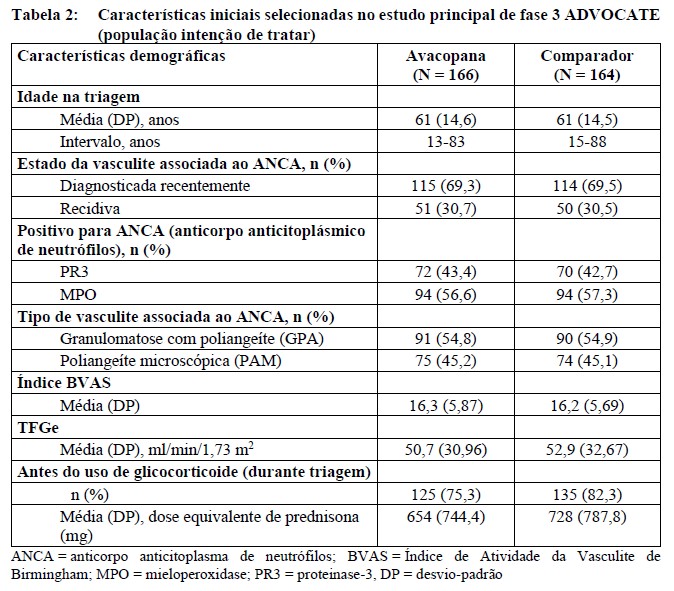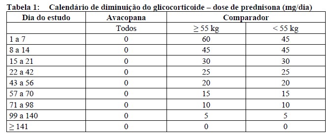 - Grupo comparador (N=164): os pacientes receberam o placebo correspondente à avacopana 2 vezes ao dia durante 52 semanas acrescido de prednisona (diminuição de 60 mg/dia para 0, ao longo de 20 semanas).
