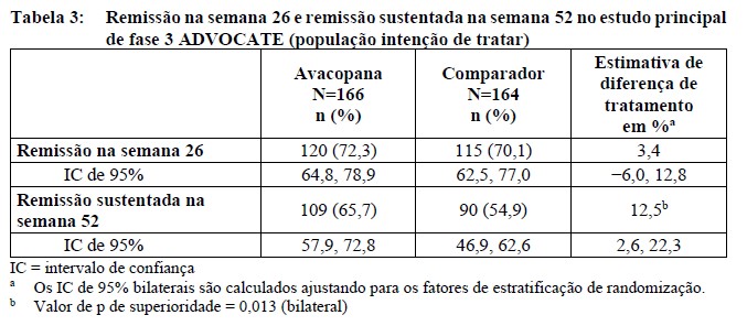 Os dois resultados do ITG (IAA e IMA) do grupo do avacopana em comparação com o grupo comparador estão resumidos na Tabela 5. As medições do ITG eram efeitos finais secundários no estudo e não foram controlados quanto à multiplicidade.