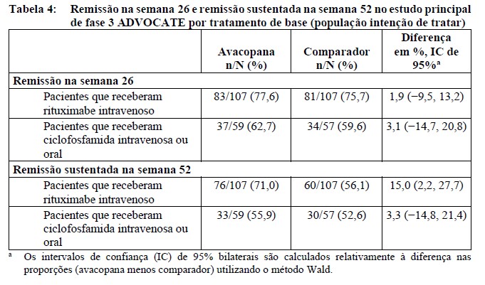 A eficácia observada foi consistente nos subgrupos pertinentes, ou seja, aqueles com a doença diagnosticada recentemente e com recidiva, positivo para ANCA com PR3 e MPO, GPA e PAM, e homens e mulheres. Os resultados da eficácia por tratamento de base são apresentados na Tabela 4.