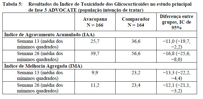 Em relação ao valor de referência na semana 26, 86,1% dos pacientes tratados com avacopana receberam glicocorticoides fornecidos fora do âmbito do estudo. No grupo comparador, a maior parte da utilização de glicocorticoides deveu-se ao ciclo de prednisona definido por protocolo.