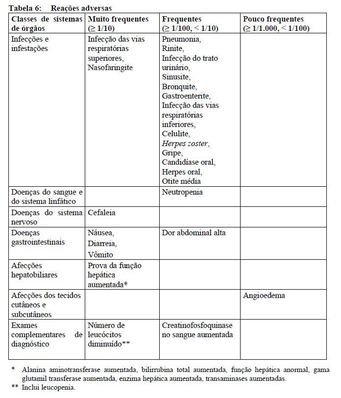 As reações adversas mais frequentes são náusea (23,5%), cefaleia (20,5%), número de leucócitos diminuído (18,7%), infecção das vias respiratórias superiores (14,5%), diarreia (15,1%), vômitos (15,1%) e nasofaringite (15,1%).