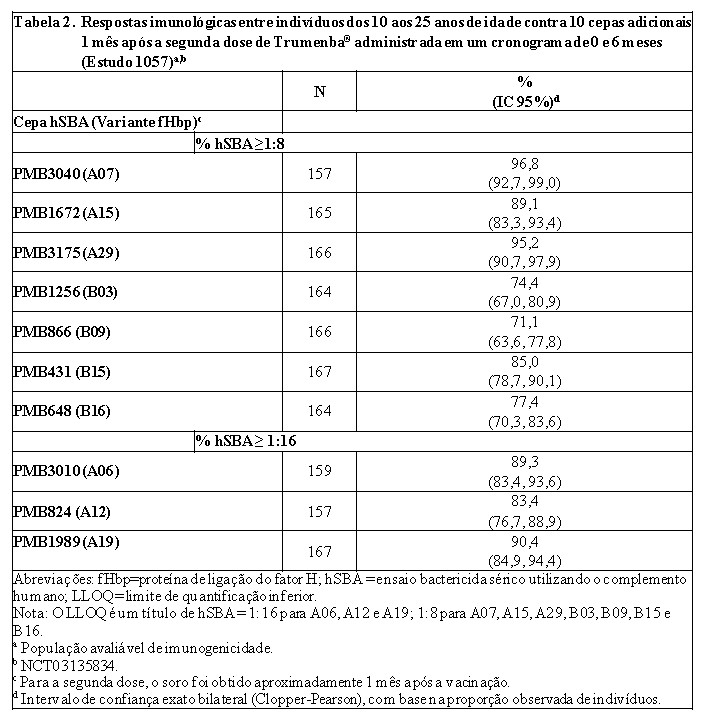 A proporção de indivíduos que atingiram um título de hSBA definido após 2 doses de Trumenba®, administradas num esquema de 0 e 6 meses, foi avaliada em relação a um painel de 10 cepas adicionais, cada uma expressando uma variante fHbp diferente (Tabela 2).