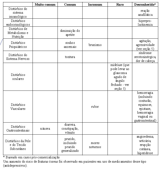 Alterações de sangramento, como equimoses, púrpura e outros eventos hemorrágicos, como sangramentos gastrointestinal ou ginecológico, foram relatadas de forma rara com o uso de antidepressivos com um efeito serotoninérgico (ISRS/IRSN). Antidepressivos com efeitos serotoninérgicos podem aumentar o risco de hemorragias pós-parto. É aconselhado ter cautela nos casos de pacientes que tomem anticoagulantes e/ou medicamentos conhecidos por afetar a função plaquetária (ex.: antipsicóticos atípicos e fenotiazinas, a maioria dos antidepressivos tricíclicos, anti-inflamatórios não-esteroidais [AINE], ácido acetilsalicílico [AAS]) (vide a Seção "INTERAÇÕES MEDICAMENTOSAS") e em pacientes com tendências/alterações conhecidas para sangramentos.