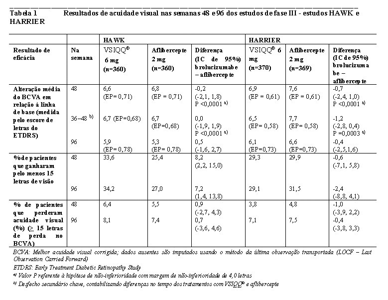 Nos estudos HAWK e HARRIER, os parâmetros anatômicos relacionados fizeram parte das avaliações da atividade da doença que norteiam as decisões de tratamento. Foram observadas reduções na espessura do subcampo central (CST) e na presença de fluido intrarretiniano/sub-retiniano (IRF/SRF) ou fluido sob o epitélio pigmentado da retina (sub-RPE) em pacientes tratados com VSIQQ®, já em 4 semanas após o início do tratamento e até a semana 48 e a semana 96. Foram demonstradas reduções maiores, estatisticamente significativas, na CST e na presença de IRF/SRF em relação ao aflibercepte nas semanas 16 e 48 (ver seção 2. RESULTADOS DE EFICÁCIA).