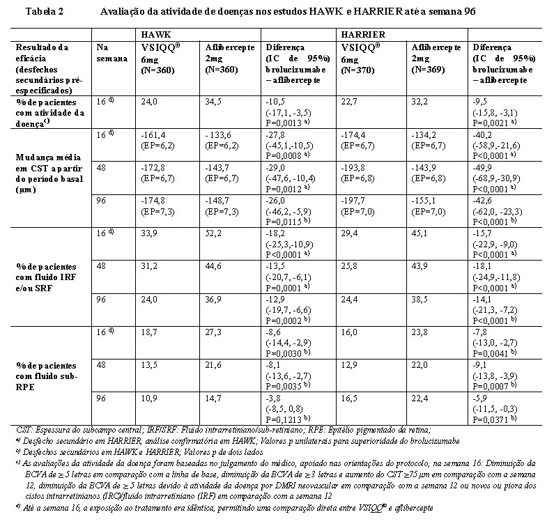A atividade da doença foi avaliada por alterações na acuidade visual e/ou parâmetros anatômicos, incluindo espessura do subcampo central (CST) e/ou presença de fluidos retinianos (IRF/SRF, sub-RPE). Na semana 16, quando a atividade da doença foi avaliada pela primeira vez para determinar o intervalo de tratamento, estatisticamente menos pacientes apresentaram atividade da doença com VSIQQ® 6 mg em comparação com aflibercepte 2 mg. A atividade da doença foi avaliada ao longo dos estudos. Os parâmetros anatômicos da atividade da doença foram menores na semana 48 e na semana 96 para o VSIQQ® em comparação com o aflibercepte (Tabela 2).