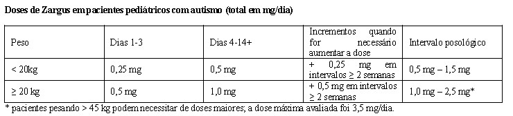 Zargus também pode ser usado para o tratamento de irritabilidade associada ao transtorno autista, em crianças e adolescentes, incluindo desde sintomas de agressividade até outros, como autoagressão deliberada, crises de raiva e angústia e mudança rápida de humor.