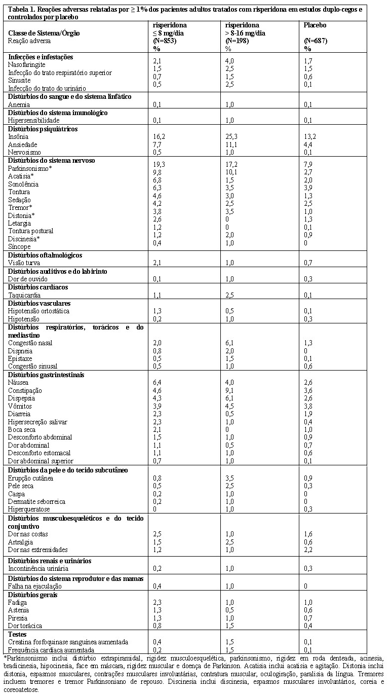 A evidência de eficácia de curto prazo com risperidona oral no tratamento de esquizofrenia é proveniente de 3 estudos clínicos duplo-cegos, comparados com ativo, que no total envolveram mais de 2.200 pacientes com esquizofrenia. Dois dos 3 estudos também tiveram um braço placebo. A eficácia da risperidona oral no tratamento de manutenção da esquizofrenia foi demonstrada em 2 estudos duplo-cegos, comparados com ativo: 1 estudo com uma duração de 12 meses e 1 estudo com uma duração de 1 a 2 anos. Para estabelecer a segurança ea eficácia do tratamento com risperidona oral em um regime de dose única diária, 3 estudos duplo-cegos foram conduzidos. Um destes 3estudos incluiu um braço placebo. Um total de 815 pacientes nestes estudos foram tratados com risperidona, dos quais 328 receberam umregime posológico de duas doses diárias e 487 um regime posológico de uma dose diária. Ambos os estudos de curta e longa duração, e os estudos de regime posológico de dose única diária, incluíram pacientes adultos com um diagnóstico de esquizofrenia de acordo com ocritério do Manual Diagnóstico e Estatístico de Transtornos Mentais.