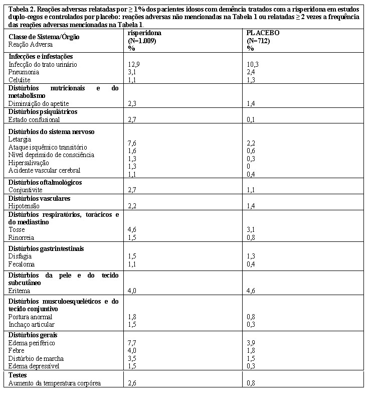 A risperidona demonstrou sua segurança e eficácia no tratamento de um ou mais Sintomas Comportamentais e Psicológicos de Demência (BPSD) em três estudos duplo-cegos, controlados por placebo, em pacientes idosos com demência. A análise agrupada da eficácia destes estudos representa dados de 1.150 pacientes idosos internados em instituição (722 tratados com risperidona). Dados de segurança de longo prazo (até 12 meses) com risperidona em pacientes idosos com demência também estão disponíveis. A população em cada um destes estudos era de pacientes que estavam internados em uma casa de repouso ou hospital e apresentavam distúrbios comportamentais que foram pelo menos problemas moderados para os cuidadores ou perigosos para eles próprios.