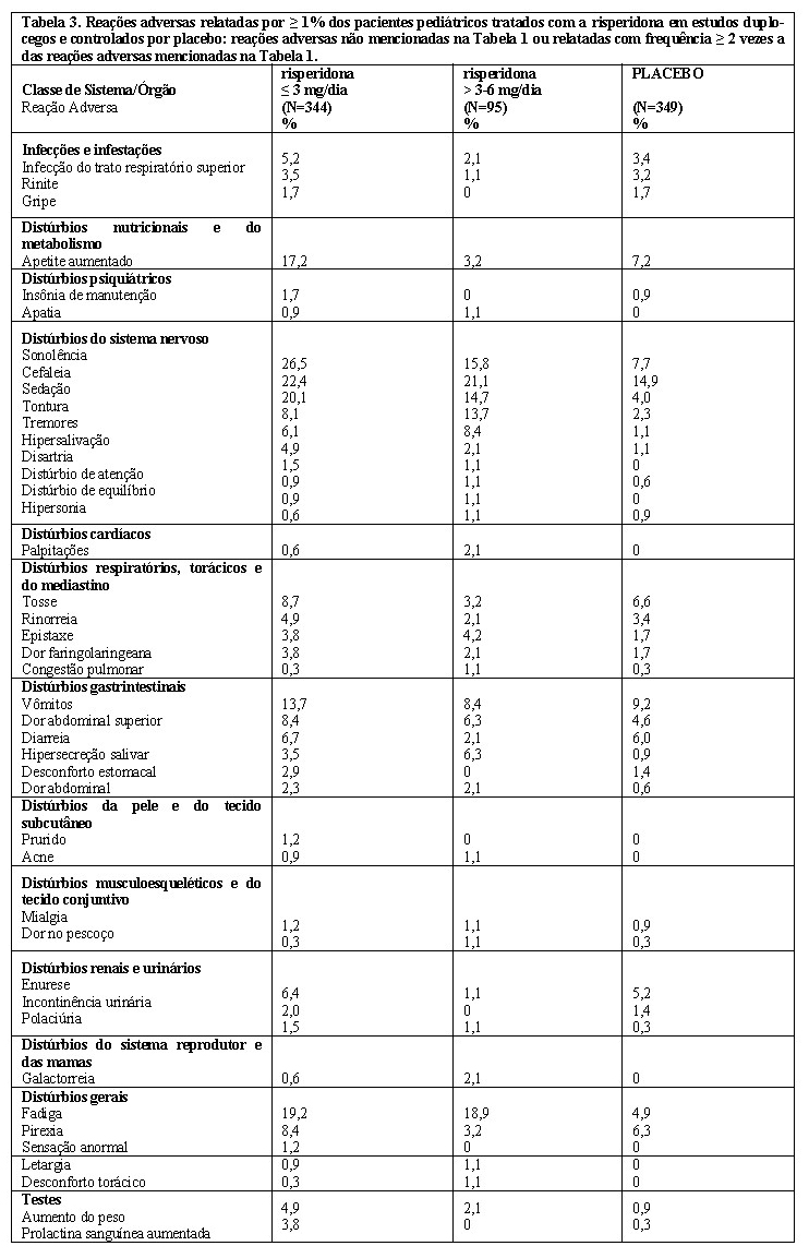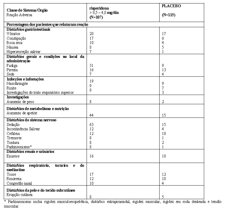 A evidência de eficácia de risperidona oral em crianças e adolescentes diagnosticadas com autismo, conforme definido pelos critérios DSM-IV, foi baseada principalmente em dois estudos duplo-cego, controlados por placebo, com duração de 8 semanas, em crianças e adolescentes com autismo ou outros Transtornos Invasivos do Desenvolvimento (TID). Um dos estudos era randomizado, duplo-cego, com grupo-paralelo, dose flexível, com duração de 8 semanas, de segurança e eficácia de risperidona em crianças e adolescentes (com idade de 5 a 17 anos e 2 meses) com autismo. O estudo foi conduzido por uma rede de unidades de pesquisa de psicofarmacologia pediátrica e patrocinado pelo Instituto Nacional de Doenças Mentais. Outro estudo era duplo-cego, randomizado, com grupo-paralelo, controlado por placebo, dose flexível, de 8 semanas, de segurança e eficácia da risperidona em crianças com idade entre 5 a 12 anos com autismo ou outros TIDs. A variável primária de eficácia em ambos os estudos foi a mudança frente a linha de base no desfecho final na subescala de irritabilidade da ABC, como preenchida pelo pai ou cuidador sob orientação de um clínico. A resposta CGI-C foi uma variável coprimária ou secundária de eficácia nestes estudos.