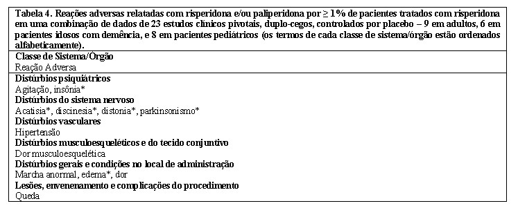 É necessário ter precaução com pacientes que recebam simultaneamente psicoestimulantes (por exemplo, metilfenidato) e risperidona, uma vez que podem surgir sintomas extrapiramidais quando se ajusta um ou ambos os medicamentos. A retirada gradual de um ou ambos os tratamentos devem ser considerados (vide "Interações Medicamentosas").