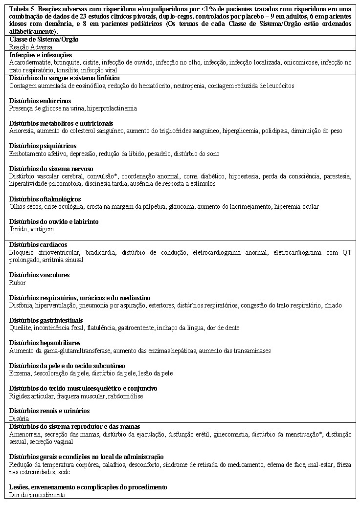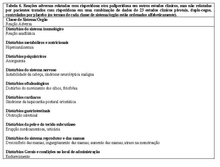 Há relatos de priapismos induzidos por medicamentos com efeitos bloqueadores alfa-adrenérgicos. Priapismo foi relatado com a risperidona durante a vigilância pós-comercialização.