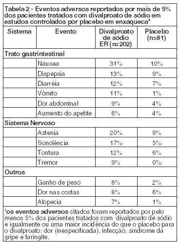 Relacionadas à mania: a incidência dos eventos decorrentes do tratamento foi baseada nos dados combinados a partir de dois estudos de divalproato de sódio controlados com placebo, em mania associada a transtorno bipolar. Os eventos adversos foram usualmente leves ou moderados na intensidade, porém algumas vezes foram graves o suficiente para o tratamento ser interrompido. Nos estudos clínicos, os índices de interrupções prematuras devido a intolerância não foram estatisticamente diferentes entre placebo, divalproato de sódio e carbonato de lítio. Um total de 4%, 8% e 11% dos pacientes respectivamente, descontinuaram o tratamento devido à terapia com placebo, divalproato de sódio e carbonato de lítio. A tabela 1 reporta os eventos adversos nos pacientes que apresentaram uma taxa maior que 5% ingerindo divalproato de sódio, sendo maior também em relação ao placebo, ou onde a incidência de eventos adversos foi estatisticamente significante maior do que no grupo placebo. Vômito foi o único evento relatado como apresentando incidência significativamente maior (p < 0,05) em pacientes tratados com divalproato em comparação com o placebo.